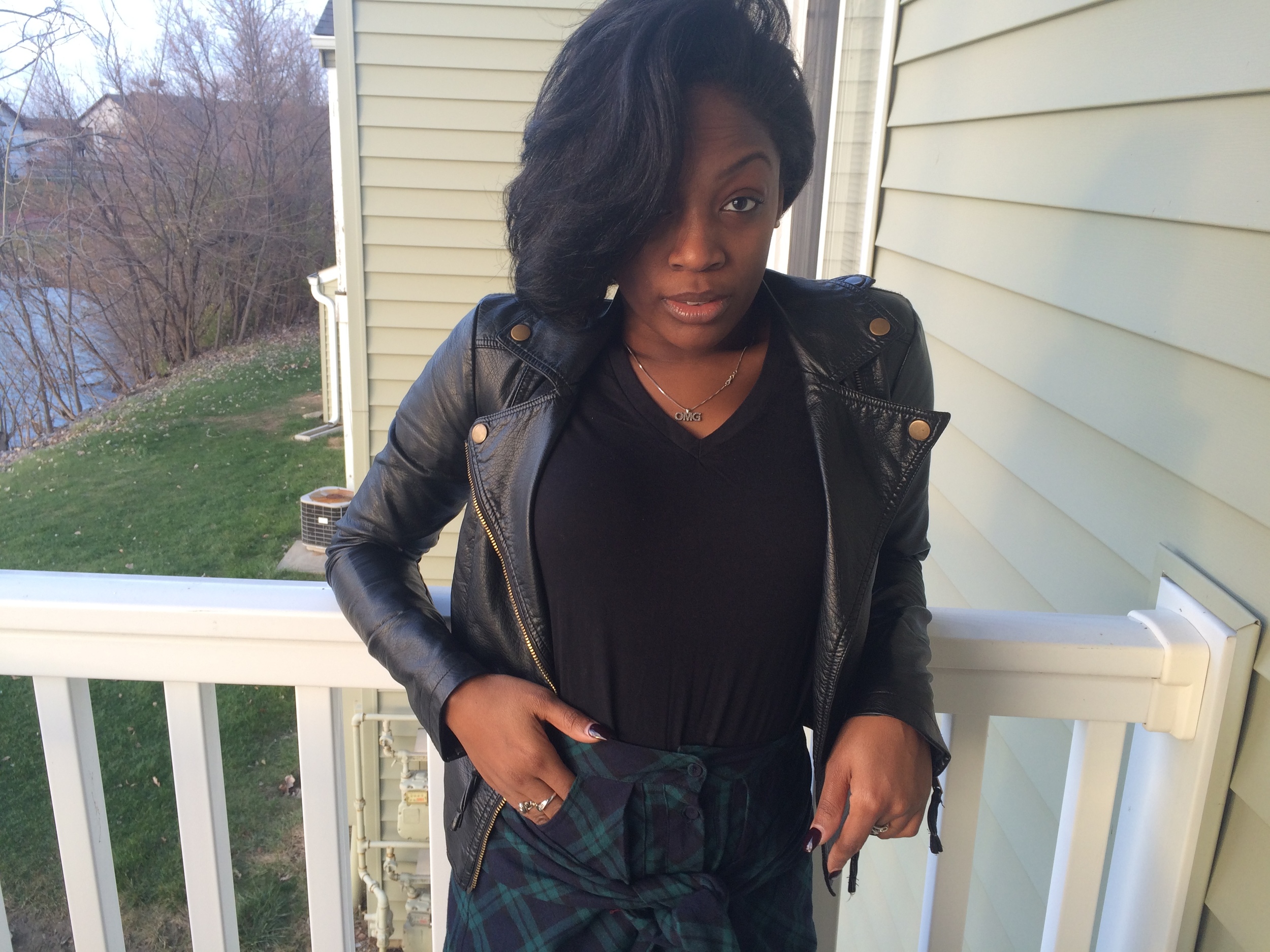So I am loving the fact that its not freezing yet so I can throw on a B L A N K E T S C A R F and a leather jacket. We actually have a fall season unlike the usual summer to winter. The blanket scarf is a go to accessory and it keeps you warm! Im loving blanket scarves, plaid, and flannel when Im feeling like being casually chic, you could say? Another trend right now is the plaid shirt tied around the waist so I found a skirt that looks like that.LOVE! Until next time...Be inspired to inspire.